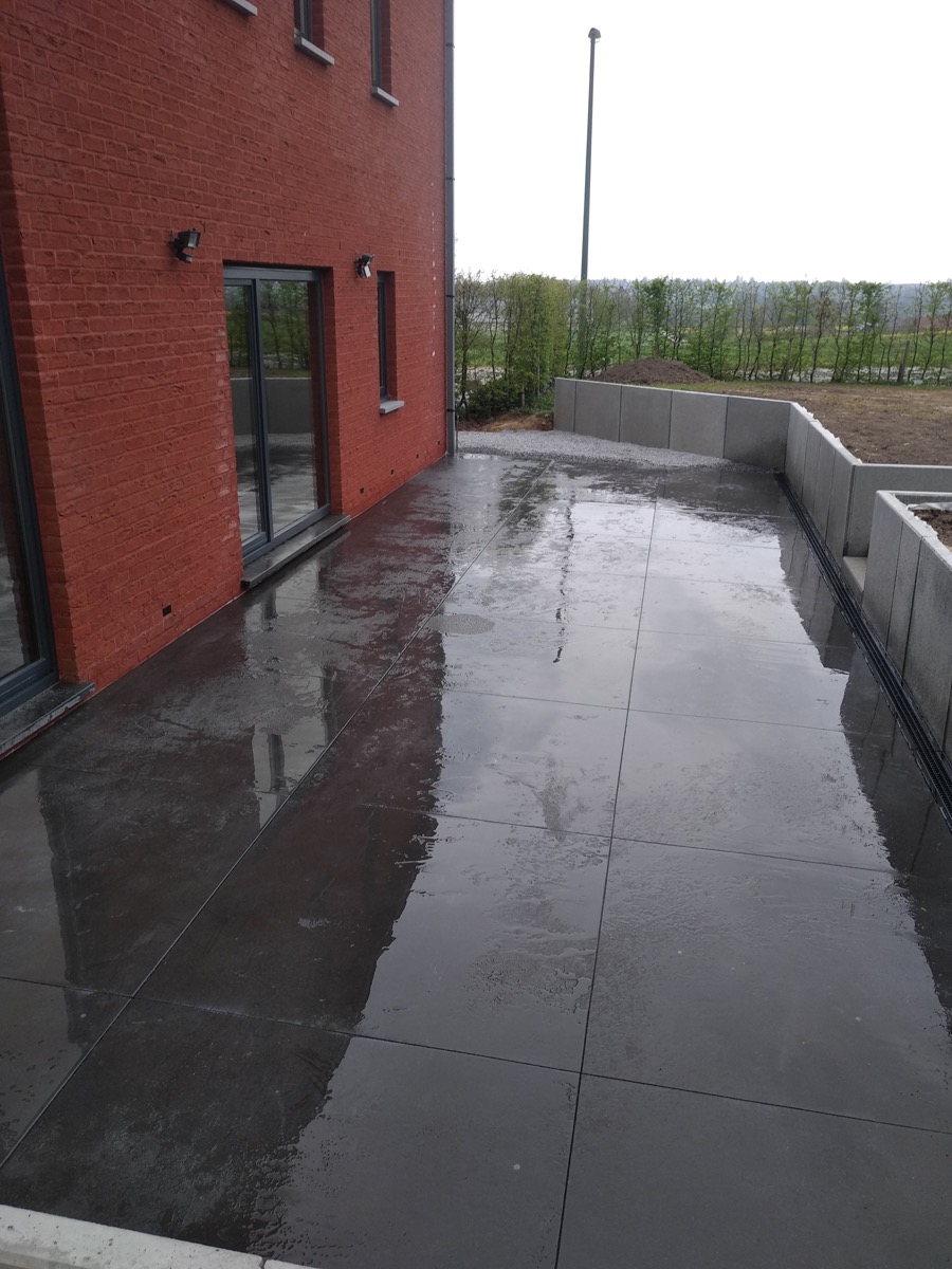 La terrasse a été réalisée avec des dalles de béton et un revêtement couleur anthracite 3% de coloration dans la masse.